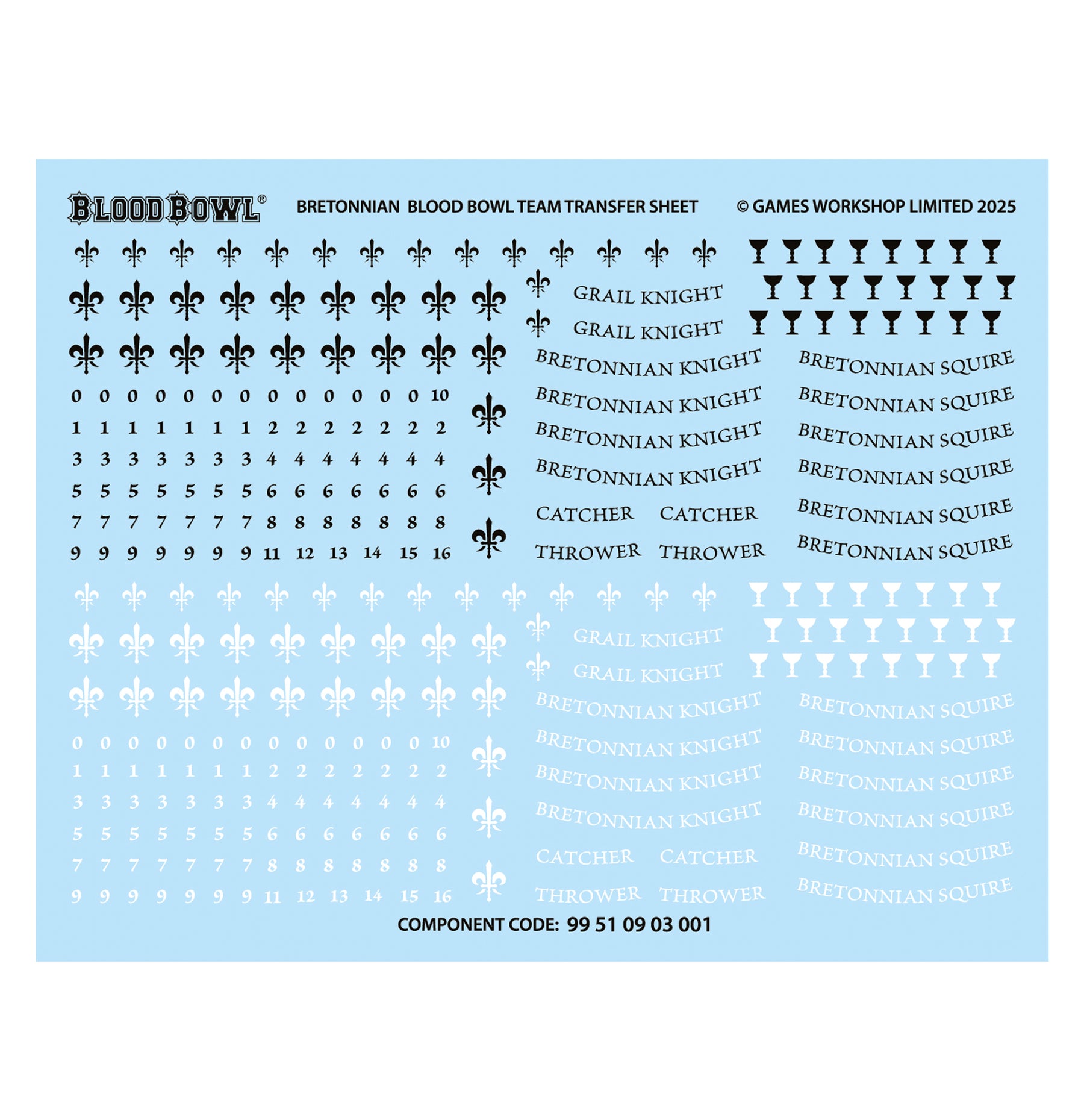 This kit is supplied with a Bretonnian Blood Bowl Team Transfer Sheet, featuring 320 high-quality waterslide transfers. These include fleur-de-lys and grail icons, role identifications, and numbers for you to decorate your miniatures.