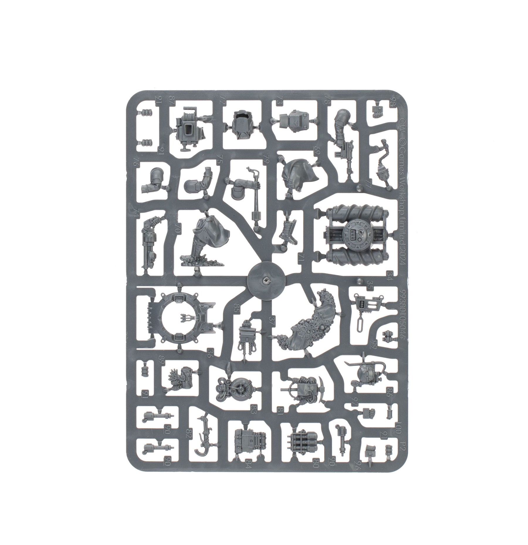 Up to two of the Death Korps of Krieg troopers can be built as Watchmasters – each armed with a plasma pistol, laspistol, or bolt pistol, and a chainsword or power weapon. Up to two troopers can each be armed with a long-las, two with a grenade launcher, two with a flamer, and two with a meltagun or plasma gun. The vox-operators can each be assembled with either binoculars or a grenade in their left hand, and up to two miniatures can be built carrying a medi-pack. There are also plenty of cosmetic accessories to further decorate your miniatures, including bayonets, pickaxes, belt pouches, grenades, and more.