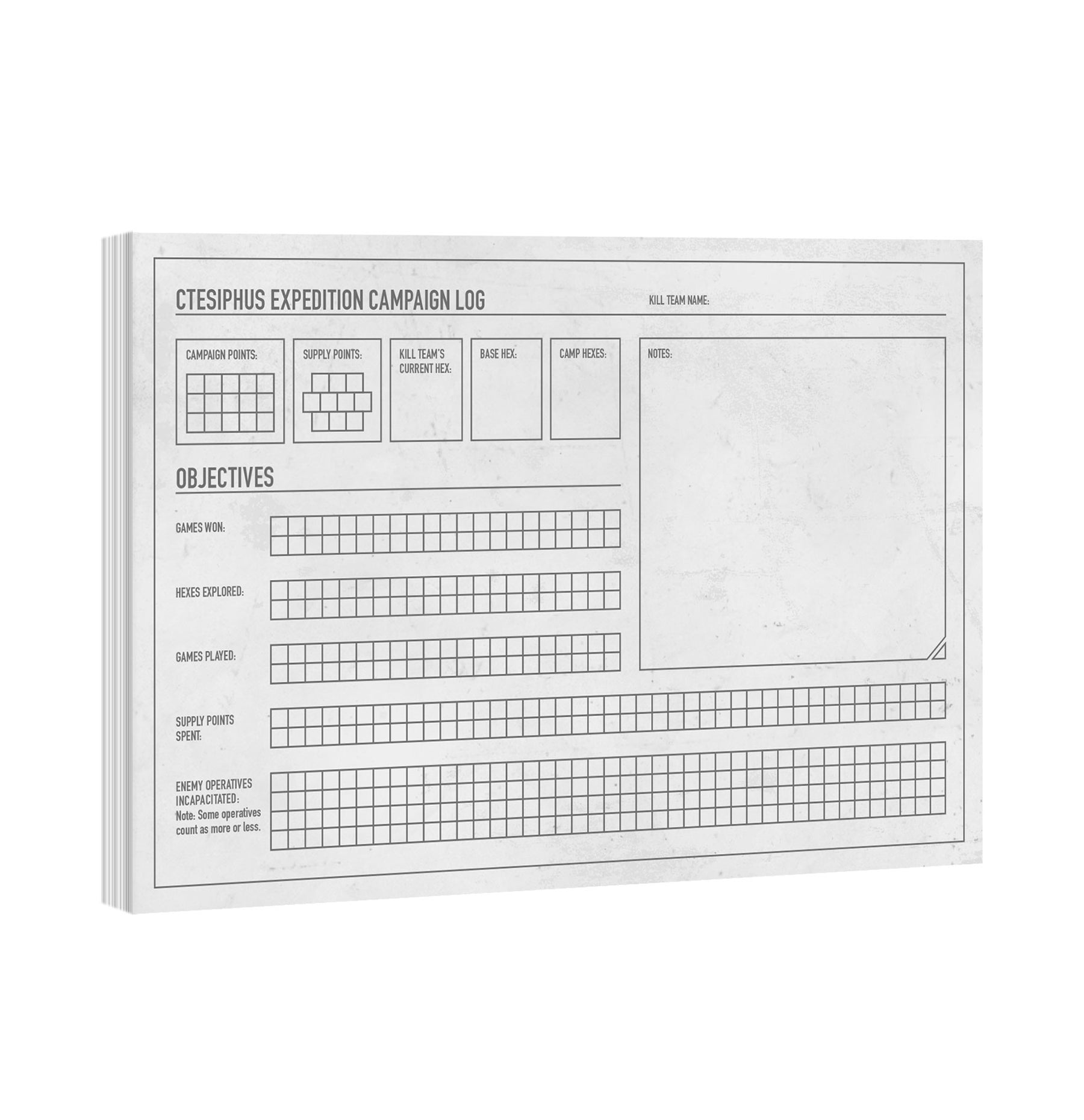 – 1x Campaign Log Pad: Easily track the progress of your kill team throughout a campaign with 40 tear-off log sheets, each measuring 210mm by 140mm.