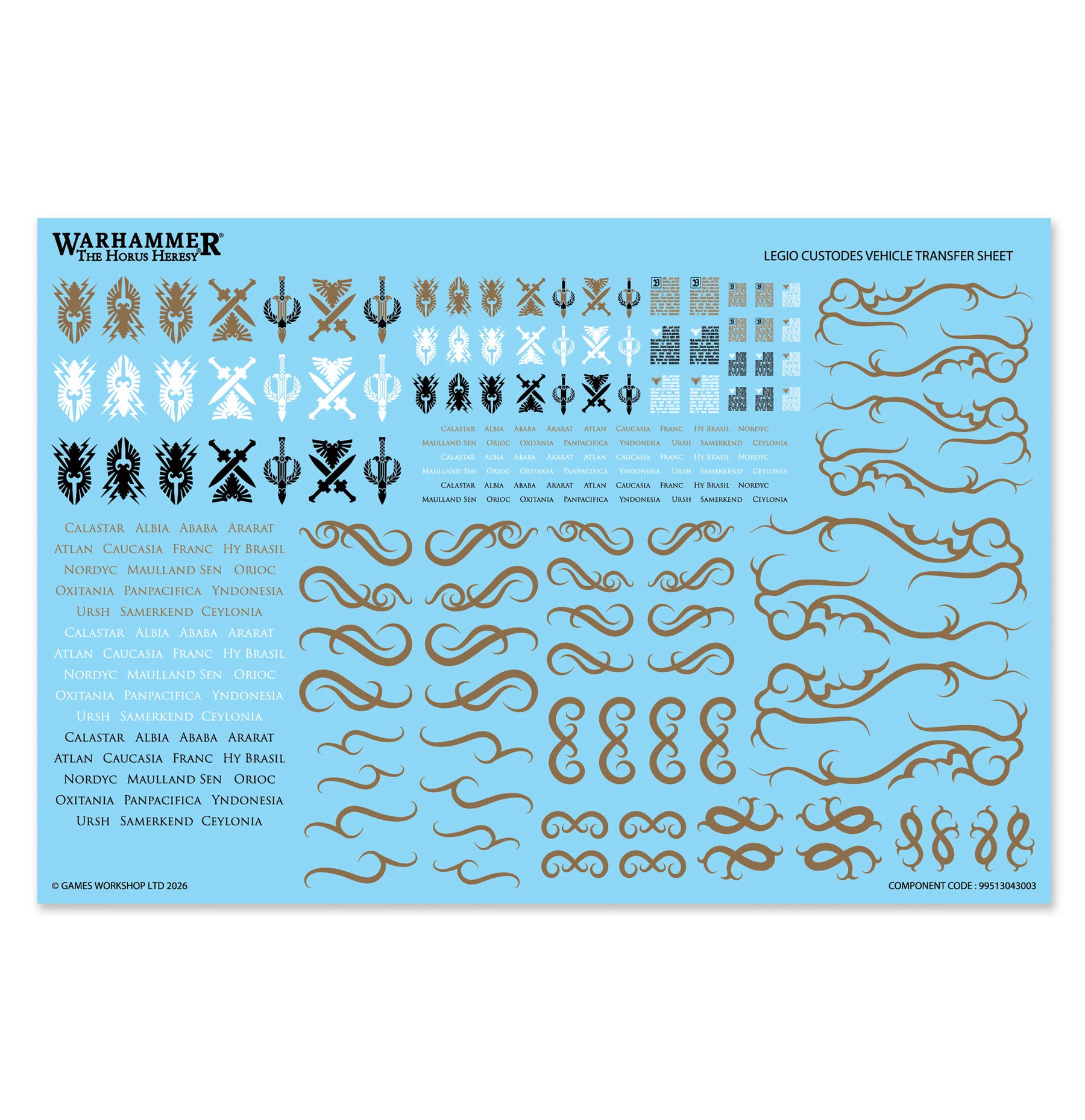 The Legio Custodes Vehicle Transfer Sheet features 210 high-quality waterslide transfers. These include Custodian symbols, text for locations of great battles, and more to decorate your miniature.