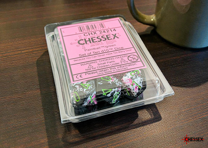 Contains 10 Brush Paintball d10 dice with green numbers (PU1014) in Plastic Clamshell