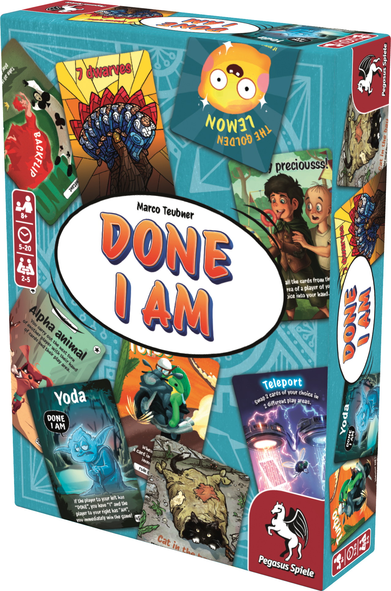 The game rules are easy to explain: To win, a player must be the first to place the three cards “DONE,” “I,” and “AM” in front of them. The player whose turn it is may either draw a new card or play a card from their hand and do what the card says. However, these basic instructions are more of a guideline because what actually takes place during a turn is dictated by the chaotic instructions found on the cards. For example, the “Dumpster wheel” first causes the discard pile to be shuffled into the draw pile, then two cards are drawn. A player could place a “Surprise!” “Orders from high above,” or “Schrödinger's nightmare” card, which can really shake up the game. DONE I AM contains 83 new cards, illustrated by 35 artists, and adds even more twists, turns and fabulously fun nonsense.