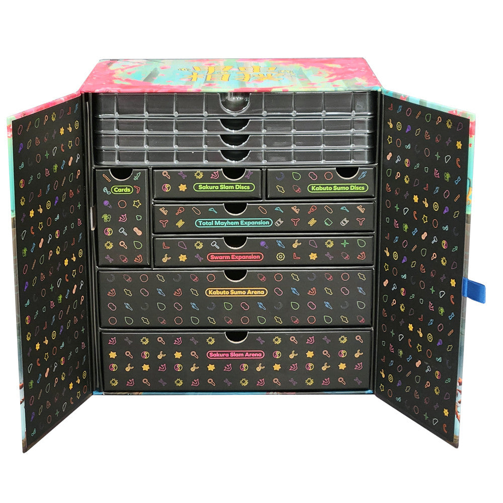 The Storage Chest has space to store the components of the Kabuto Sumo base game, Sakura Slam, Insect All-Stars, Total Mayhem, Swarm, and promos. It includes 3 plastic trays with lids, 7 drawers, 4 dividers, 2 metal tokens, 2 sticker sheets, and a guide.