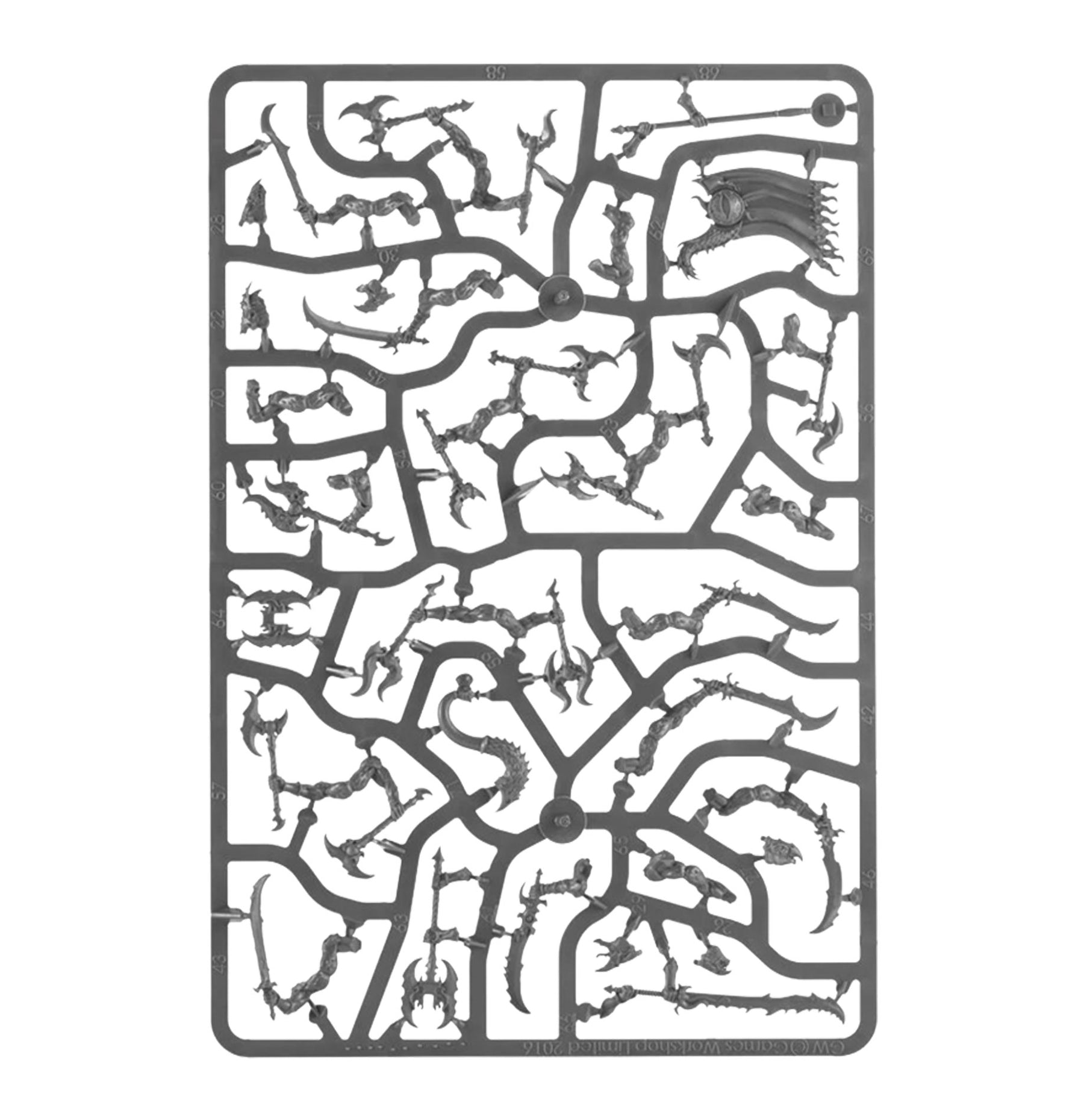 The Tzaangors can each be armed with a blade and a shield or a pair of blades, and there are parts to build an optional champion, standard bearer, and musician. The beaks, horns, manes, weapons, and shields are interchangeable across the miniatures. You can optionally build two heavily mutated Tzaangors, and you can arm up to four miniatures with vicious two-handed blades.