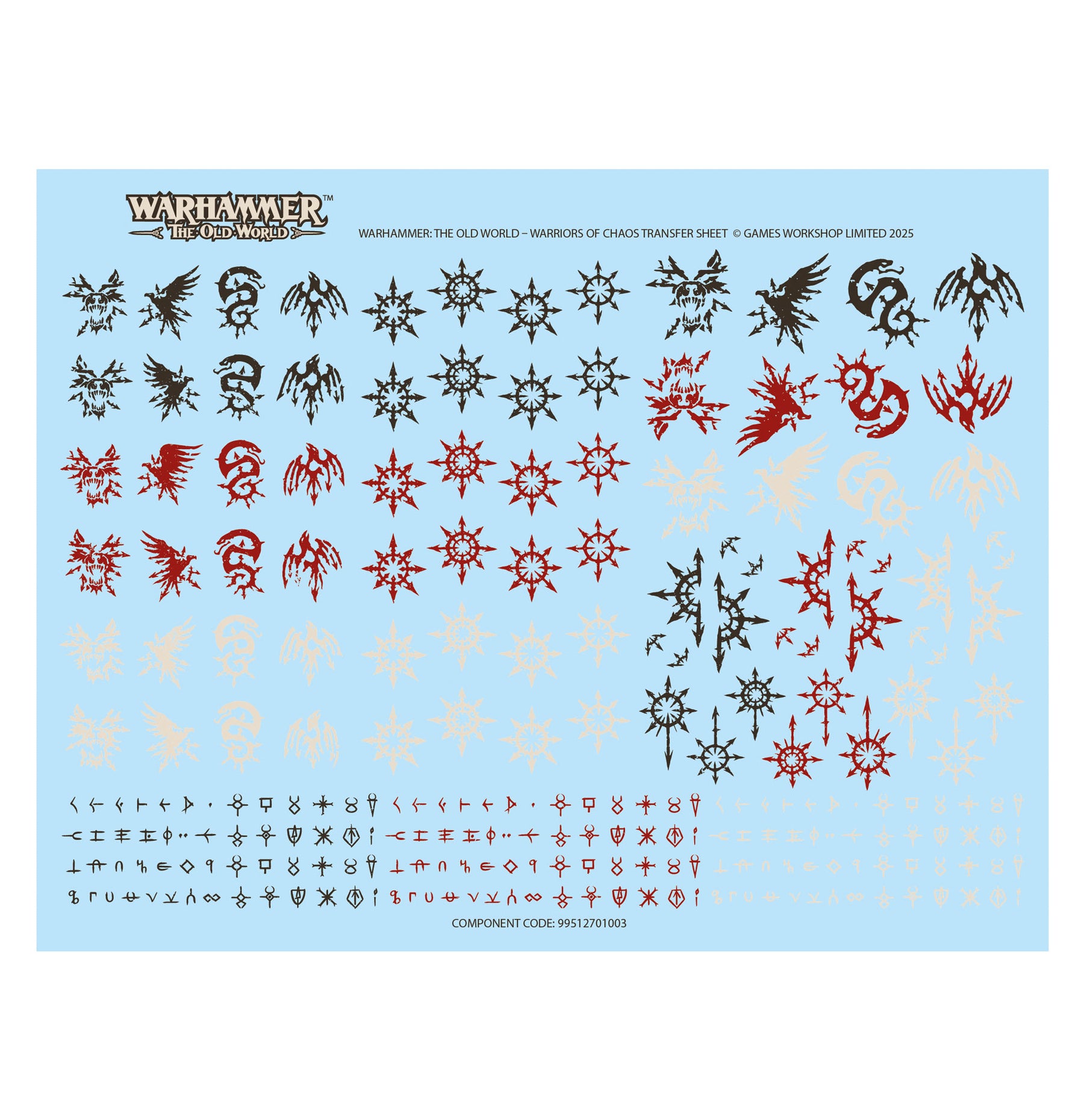 This kit is supplied with 2x Warriors of Chaos Transfer Sheets, each containing 246x high-quality waterslide transfers. These include markings for the Cult of the Bloodied Hound, the Cult of the Slithering Serpent, the Cult of the Carrion Crow, and the Cult of the Fell Raptor, along with other Chaos symbols and cursed runes.